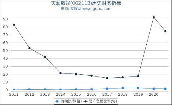 - 资产负债比率是指流动负债和长期负债与总资产的比率。 天润数娱(002113)(以下简称“本公司”)当前资产负债比率0.75高于历史平均水平0.33,说明本公司经营风险正在上升; 当前资产负债比率0.75高于行业平均水平0.53,说明本公司经营风险处于行业上游。