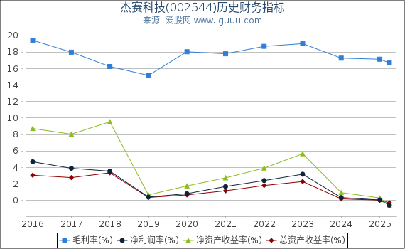 - 毛利率是指毛利占销售收入的百分比。 杰赛科技(002544)(以下简称“本公司”)当前毛利率0.17低于历史平均水平0.21,说明本公司业务竞争力正在下降; 当前毛利率0.17低于行业平均水平0.31,说明本公司业务竞争力处于行业下游。