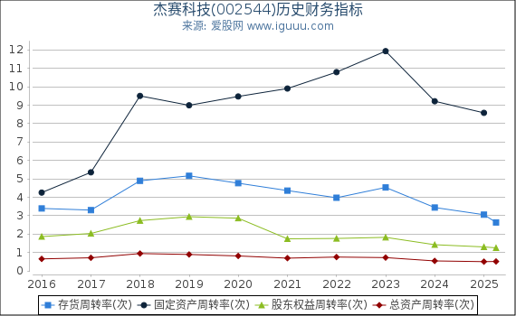 - 总资产周转率是指销售收入净额与总资产平均净值的比率。 杰赛科技(002544)(以下简称“本公司”)当前总资产周转率0.51低于历史平均水平0.81,说明本公司整体资产的营运能力正在下降; 当前总资产周转率0.51高于行业平均水平0.51,说明本公司整体资产的营运能力处于行业上游。