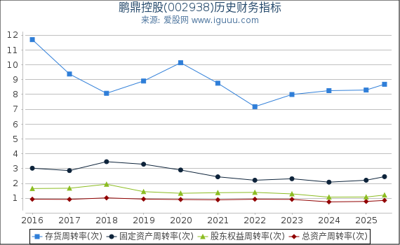 - 总资产周转率是指销售收入净额与总资产平均净值的比率。 鹏鼎控股(002938)(以下简称“本公司”)当前总资产周转率0.86低于历史平均水平0.97,说明本公司整体资产的营运能力正在下降; 当前总资产周转率0.86高于行业平均水平0.73,说明本公司整体资产的营运能力处于行业上游。
