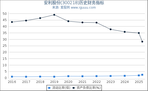 - 流动比率是指流动资产与流动负债的比率。 安利股份(300218)(以下简称“本公司”)当前流动比率2.54高于历史平均水平1.22,说明本公司短期偿债能力正在上升; 当前流动比率2.54高于行业平均水平1.30,说明本公司短期偿债能力处于行业上游。