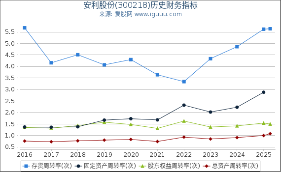 - 存货周转率是指主营业务成本与平均存货余额的比率。 安利股份(300218)(以下简称“本公司”)当前存货周转率5.64高于历史平均水平4.58,说明本公司存货运营效率正在上升; 当前存货周转率5.64高于行业平均水平4.31,说明本公司存货运营效率处于行业上游。