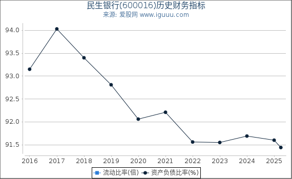 - 资产负债比率是指流动负债和长期负债与总资产的比率。 民生银行(600016)(以下简称“本公司”)当前资产负债比率0.91低于历史平均水平0.94,说明本公司经营风险正在下降; 当前资产负债比率0.91低于行业平均水平0.92,说明本公司经营风险处于行业下游。
