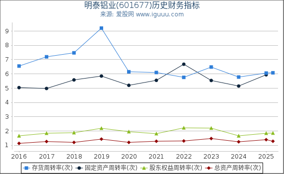 - 总资产周转率是指销售收入净额与总资产平均净值的比率。 明泰铝业(601677)(以下简称“本公司”)当前总资产周转率1.28低于历史平均水平1.49,说明本公司整体资产的营运能力正在下降; 当前总资产周转率1.28低于行业平均水平1.35,说明本公司整体资产的营运能力处于行业下游。