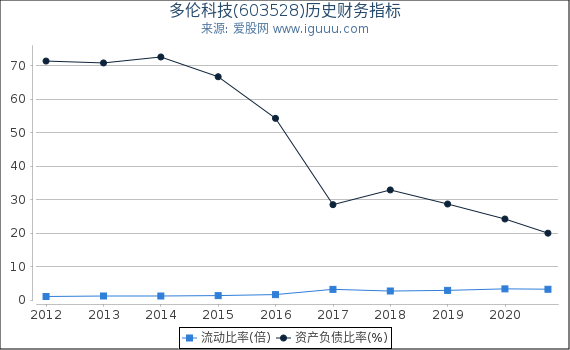 - 资产负债比率是指流动负债和长期负债与总资产的比率。 多伦科技(603528)(以下简称“本公司”)当前资产负债比率0.20低于历史平均水平0.53,说明本公司经营风险正在下降; 当前资产负债比率0.20低于行业平均水平0.52,说明本公司经营风险处于行业下游。