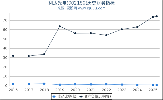 - 资产负债比率是指流动负债和长期负债与总资产的比率。 利达光电(002189)(以下简称“本公司”)当前资产负债比率0.74高于历史平均水平0.36,说明本公司经营风险正在上升; 当前资产负债比率0.74高于行业平均水平0.52,说明本公司经营风险处于行业上游。