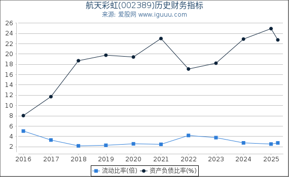 - 流动比率是指流动资产与流动负债的比率。 航天彩虹(002389)(以下简称“本公司”)当前流动比率2.74低于历史平均水平4.85,说明本公司短期偿债能力正在下降; 当前流动比率2.74高于行业平均水平1.47,说明本公司短期偿债能力处于行业上游。