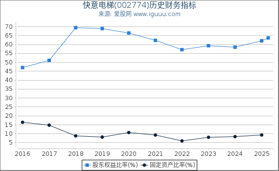 - 净资产收益率是指净利润额与净资产的比值。 快意电梯(002774)(以下简称“本公司”)当前净资产收益率0.09低于历史平均水平0.18,说明本公司运用资产的能力正在下降; 当前净资产收益率0.09高于行业平均水平0.08,说明本公司运用资产的能力处于行业上游。