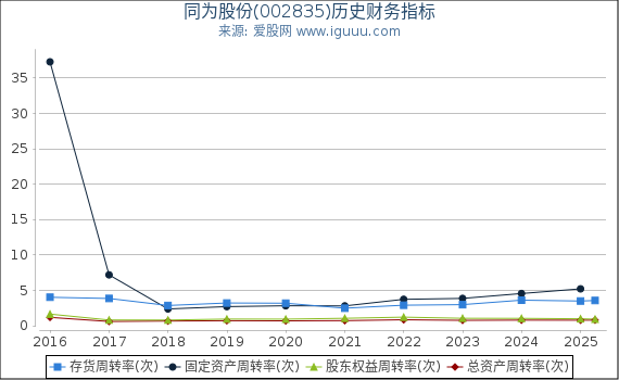 - 总资产周转率是指销售收入净额与总资产平均净值的比率。 同为股份(002835)(以下简称“本公司”)当前总资产周转率0.79低于历史平均水平0.97,说明本公司整体资产的营运能力正在下降; 当前总资产周转率0.79高于行业平均水平0.73,说明本公司整体资产的营运能力处于行业上游。