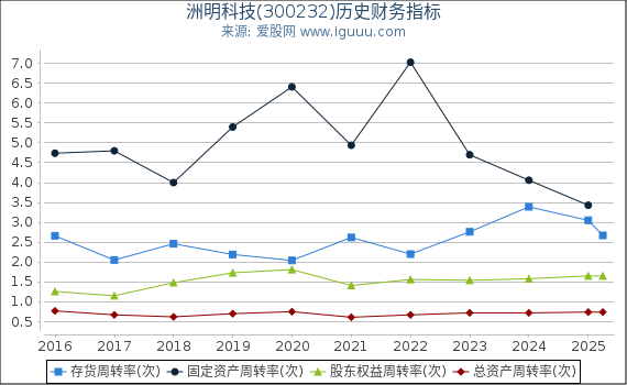 - 总资产周转率是指销售收入净额与总资产平均净值的比率。 洲明科技(300232)(以下简称“本公司”)当前总资产周转率0.74低于历史平均水平0.82,说明本公司整体资产的营运能力正在下降; 当前总资产周转率0.74高于行业平均水平0.73,说明本公司整体资产的营运能力处于行业上游。