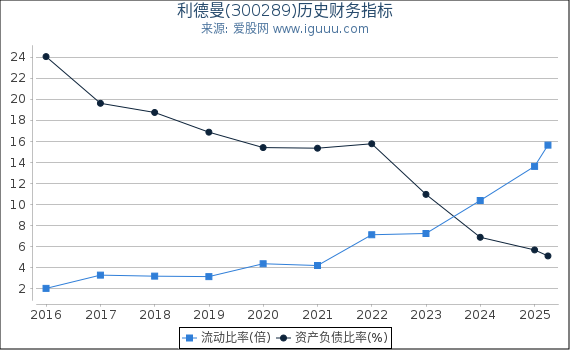 - 流动比率是指流动资产与流动负债的比率。 利德曼(300289)(以下简称“本公司”)当前流动比率15.64高于历史平均水平2.98,说明本公司短期偿债能力正在上升; 当前流动比率15.64高于行业平均水平1.94,说明本公司短期偿债能力处于行业上游。