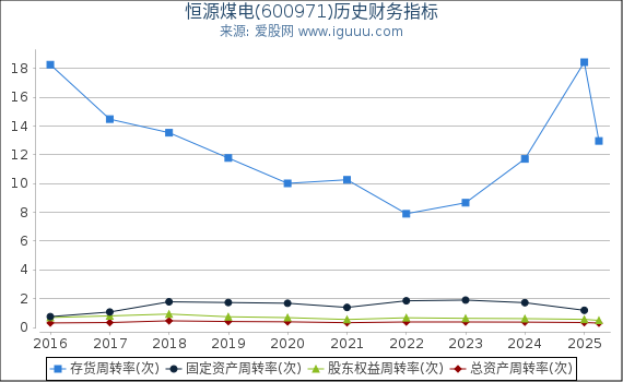 - 存货周转率是指主营业务成本与平均存货余额的比率。 恒源煤电(600971)(以下简称“本公司”)当前存货周转率12.96低于历史平均水平19.20,说明本公司存货运营效率正在下降; 当前存货周转率12.96低于行业平均水平17.74,说明本公司存货运营效率处于行业下游。